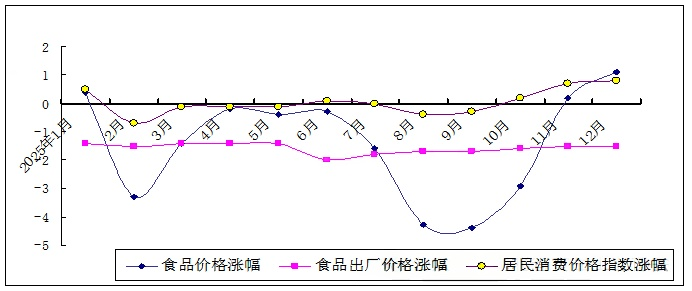 从全年来看,气温总体偏高、不利天气影响总体偏小,鲜菜价格由上年上涨5.0%转为下降3.9%;生猪供应持续增加,猪肉价格由上年上涨7.7%转为下降6.1%;蛋鸡存栏量处于历史高位,鸡蛋价格下降8.5%,降幅比上年扩大3.4个百分点;养殖规模持续优化缩减,牛肉和羊肉价格降幅明显收窄,全年分别下降1.1%和1.5%;薯类、水产品和鲜果价格分别上涨5.1%、1.4%和1.2%;其他食品价格基本稳定。