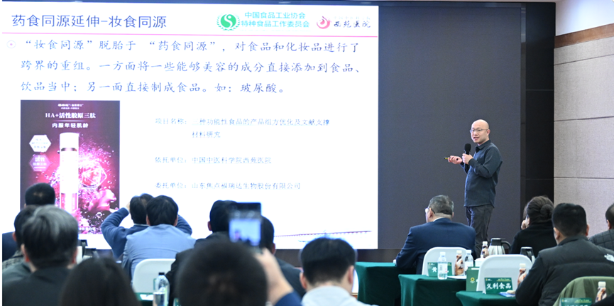 中国中医科学院西苑医院副研究员、中国药膳研究会理事、国家保健食品注册咨询专家、国家特医食品注册咨询专家李峰杰做了题为《绿色食品明珠:药食同源产品概述及研发思路》的主题演讲。他表示,药食同源产业最重要的一个发展趋势是全产业链的绿色化,只有如此才能与时俱进地升级全产业链,形成新质生产力。他认为,Z世代正成为药食同源产品的消费主力,推动药食同源产品在休闲零食、乳品、饮品等领域不断创新。他强调,企业要想突破现状、做出创新产品甚至爆品,必须顺应食品健康化、功能化、科学化的发展趋势,遵循“组方有据,工艺科学,功效验证”的原则,基于市场需求、基于临床大病种、基于当地资源优势、基于中医古籍和临床经验进行研发。他前瞻性地指出,药食同源膳食补充剂有望成为未来食品产业的重点发展方向,这种传统智慧与现代食品技术的深度融合,将重塑现有多数食品品类。药食同源不仅为相关产业带来新的发展机遇,更是整个食品行业实现转型升级的重要路径,能够为传统食品赋予健康功能与价值提升,助力产品增强竞争力、提高附加值。