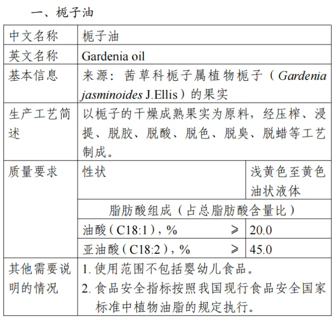 栀子油是以茜草科栀子属植物栀子(Gardenia jasminoides J.Ellis)的干燥成熟果实为原料,经压榨、浸提、脱胶、脱酸、脱色、脱臭、脱蜡等工艺制成。栀子原产于我国,在我国江西、河南、福建等地区广泛种植。栀子油富含不饱和脂肪酸,主要包括:亚油酸和油酸等,且含有少量的蛋白质、维生素、矿物质和角鲨烯等成分。从风险预防原则考虑,本产品使用范围不包括婴幼儿食品。该原料的食品安全指标按照我国现行食品安全国家标准中植物油脂的规定执行。