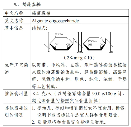 褐藻寡糖是以海带、马尾藻、巨藻、泡叶藻等褐藻类植物来源的海藻酸钠为原料,经盐酸溶解、高温降解、氢氧化钠中和、脱色、纯化、浓缩、干燥等工艺制成。褐藻寡糖是由β-D-甘露糖醛酸钠和α-L-古罗糖醛酸钠经1,4-糖苷键交替连接形成的聚合度为2~10的一种低聚糖。本产品推荐食用量≤4 克/天(以褐藻寡糖含量90.0 g/100 g计,超过该含量的按照实际含量折算)。鉴于褐藻寡糖在婴幼儿、孕妇和哺乳期妇女人群中的食用安全性资料不足,从风险预防原则考虑,上述人群不宜食用。该原料的食品安全指标按照公告规定执行,配套参考检验方法见国家食品安全风险评估中心官网“三新食品”栏目。日本批准褐藻寡糖作为特定保健用食品;我国台湾地区已将其作为食品原料使用。
