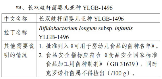 长双歧杆菌婴儿亚种YLGB-1496(Bifidobacterium longum subsp. infantis YLGB-1496)属双歧杆菌属长双歧杆菌婴儿亚种,本产品从母乳中分离获得。本次批准列入《可用于婴幼儿食品的菌种名单》,作为可用于婴幼儿食品的菌种用于食品中直接食用。该原料的食品安全指标按照公告规定执行。长双歧杆菌婴儿亚种已被列入我国《可用于食品的菌种名单》和欧洲食品安全局资格认定(QPS)名单的推荐微生物列表。