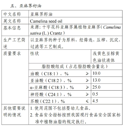 亚麻荠籽油是以十字花科亚麻荠属植物亚麻荠(Camelina sativa (L.) Crantz)的种子为原料,经筛选、压榨、沉淀、过滤等工艺制成。亚麻荠原产于中亚及地中海等地区,在我国东北、西北、华北等地区广泛种植。亚麻荠籽油富含不饱和脂肪酸,主要包括:α-亚麻酸、亚油酸和油酸等,且含有少量的蛋白质、维生素和矿物质。从风险预防原则考虑,本产品使用范围不包括婴幼儿食品。该原料的食品安全指标按照我国现行食品安全国家标准中植物油脂的规定执行。亚麻荠籽油在美国被作为“一般认为安全的物质(GRAS)”管理;加拿大批准其为新食品原料;欧盟允许其作为食品原料。