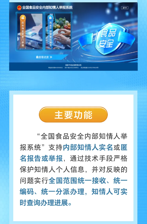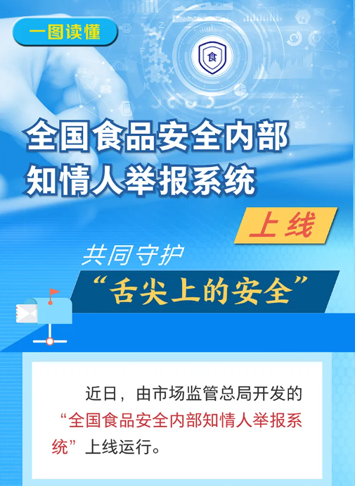 近日,市场监管总局开发的“全国食品安全内部知情人举报系统”正式上线运行。该系统聚焦激活食品生产经营单位“内部吹哨人”机制,畅通从业者及关联人员举报食品安全违法线索的渠道,与“全国12315平台”形成联动,推动构建“全民参与、全程监督”的食品安全社会共治格局。