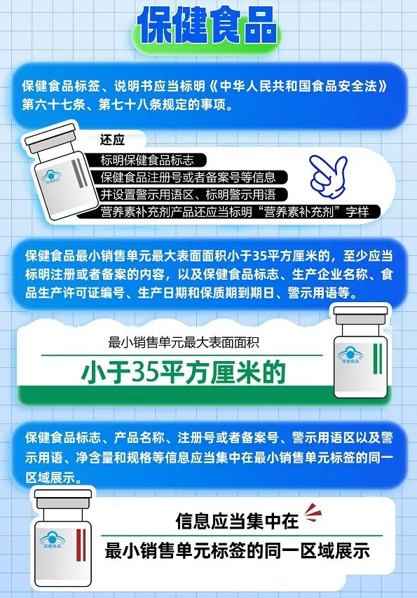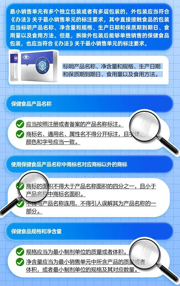 关键内容更加清晰,解决“不好找”问题。聚焦老年群体需求,要求保健食品产品名称的字体、颜色、字号和标注位置更加清晰明确;直接接触食品的包装要求标明产品名称、保质期到期日、食用量以及食用方法等关键信息,解决拆除外包装后找不到保健食品重要信息问题。