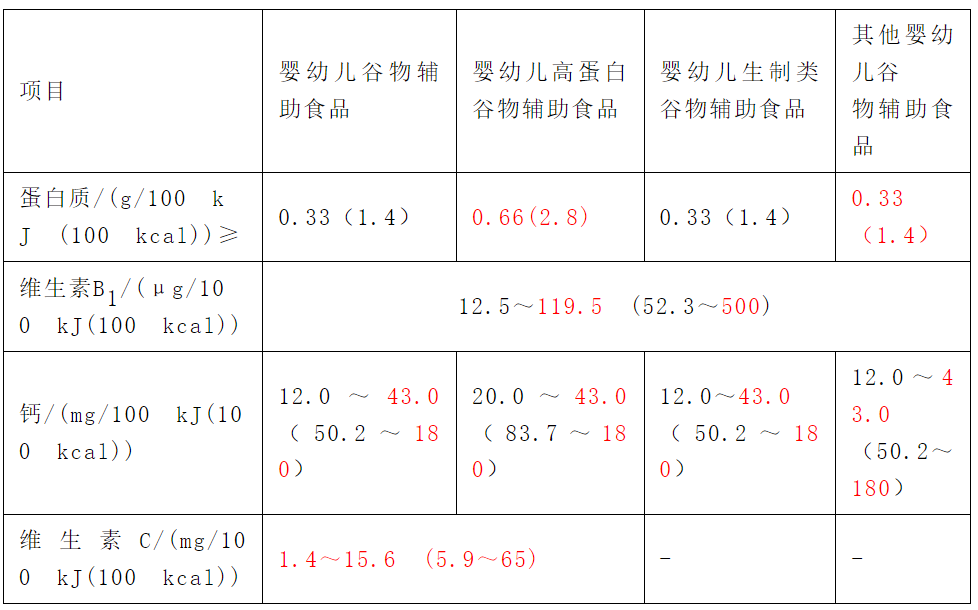 基本的营养成分指标变化:鉴于我国婴幼儿人群贫血率状况、植物性食物中铁吸收率较低,维生素C有助于提高铁的吸收率以及谷类辅助食品生产加工工艺等因素,将维生素C由可选择营养成分调整为婴幼儿谷物辅助食品和婴幼儿高蛋白谷物辅助食品基本营养成分;新增维生素B1和钙的上限值,删除婴幼儿高蛋白谷物辅助食品和其他婴幼儿谷物辅助食品的蛋白质上限值。调整的营养素指标要求如下表: