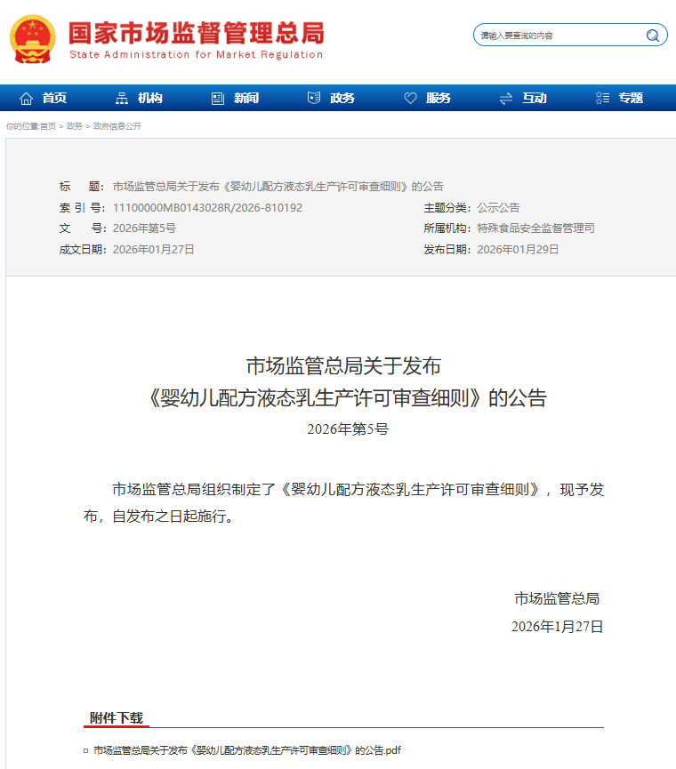 刚刚,国家市场监督管理总局发布了《婴幼儿配方液态乳生产许可审查细则》(以下简称《细则》)。