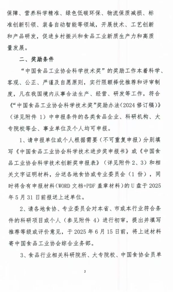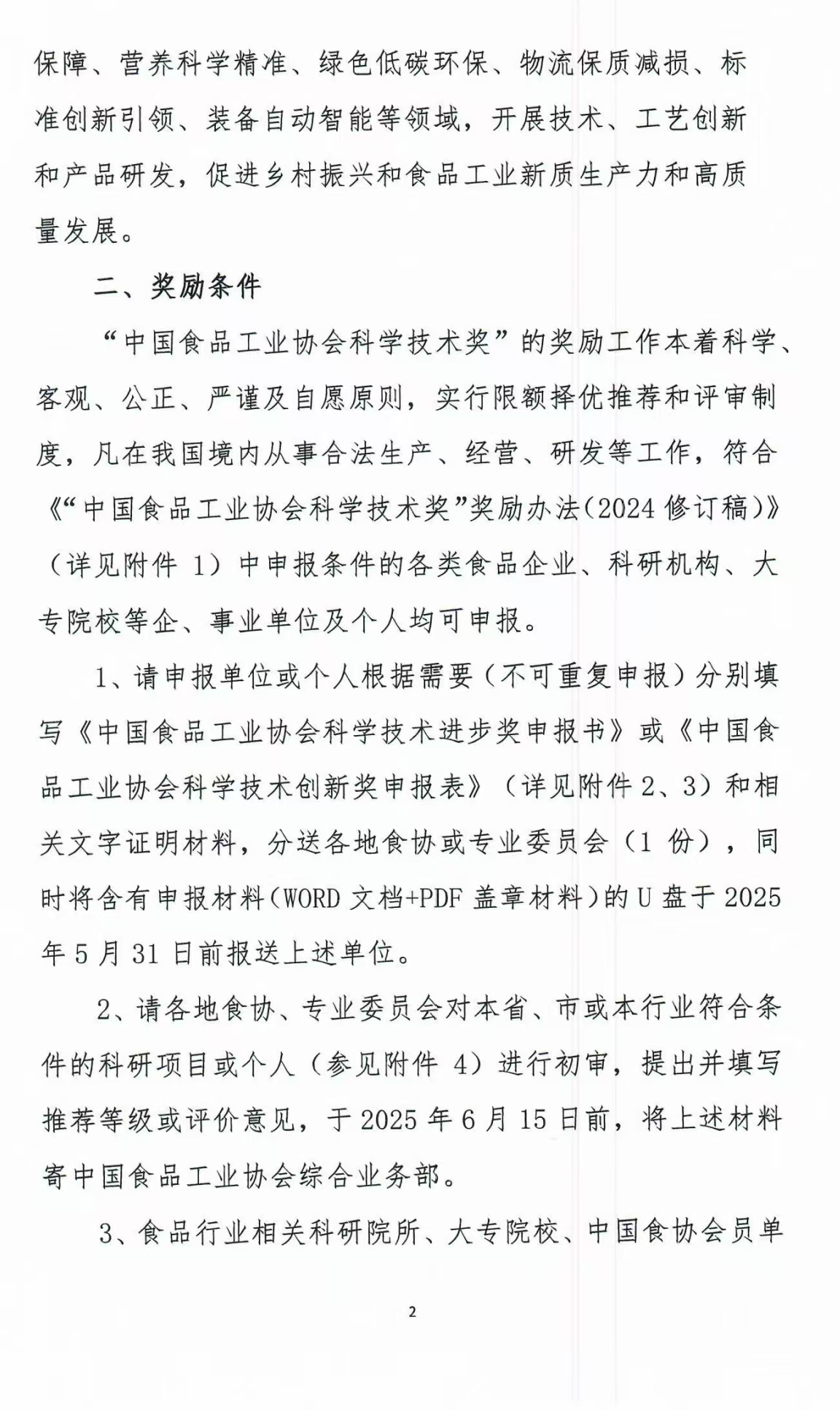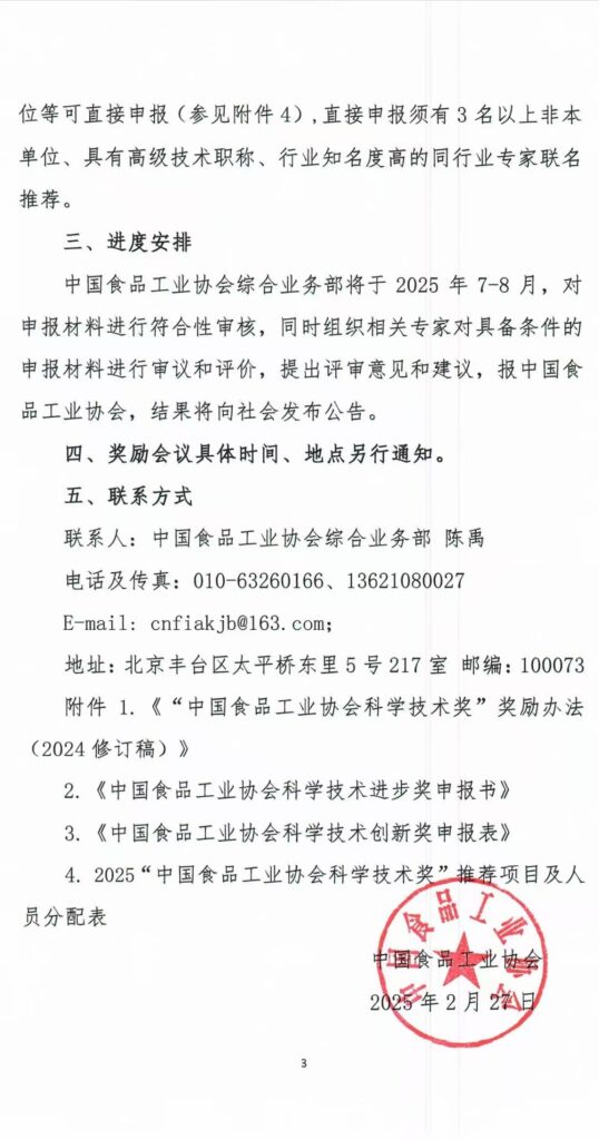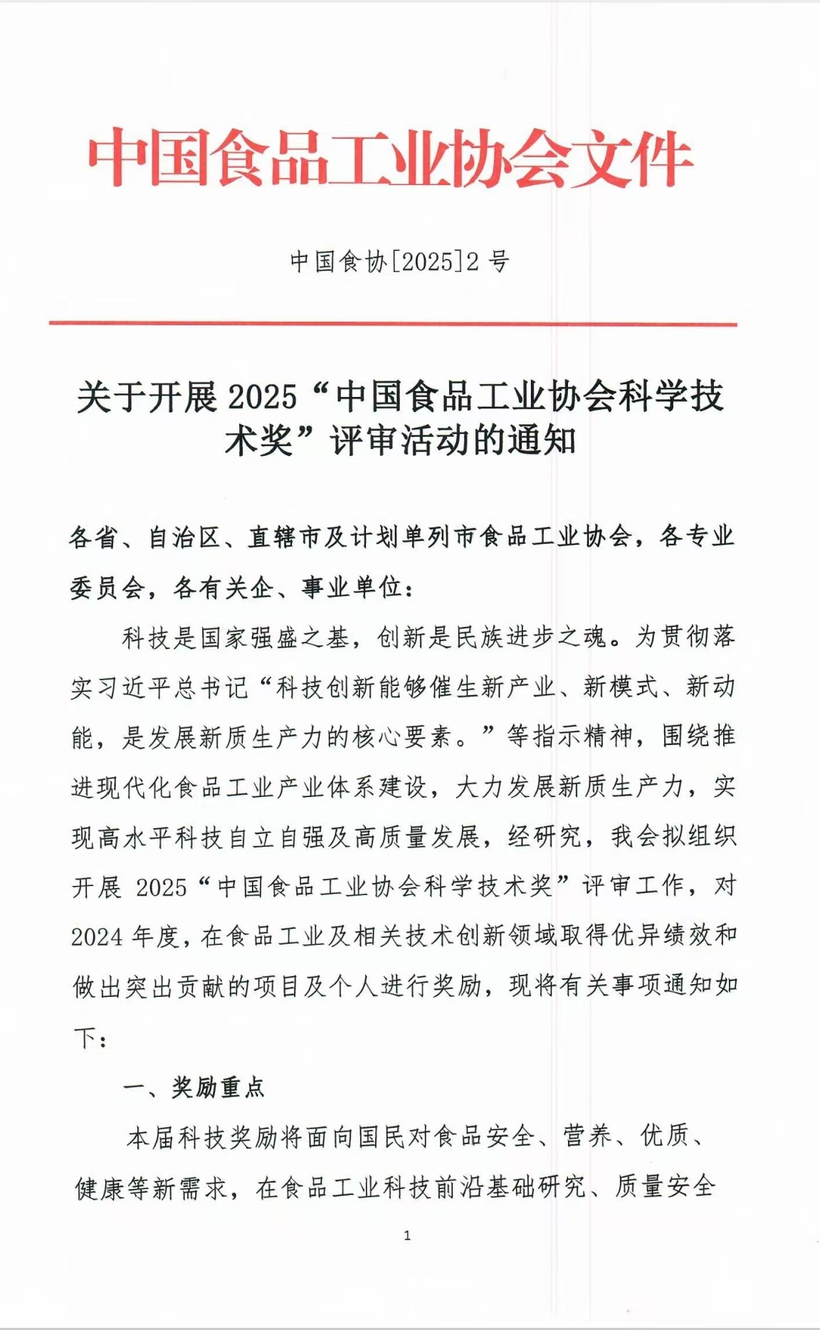 2025“中国食协科学技术奖”评审活动启动 中国食协特食委 2025年3月3日 12:30 附件1:奖励办法(2024修订稿)下载 附件2:中国食品工业协会科学技术进步奖申报书下载 附件3:中国食品工业协会科学技术创新奖申报表下载 附件4:2025科技奖名额分配表下载