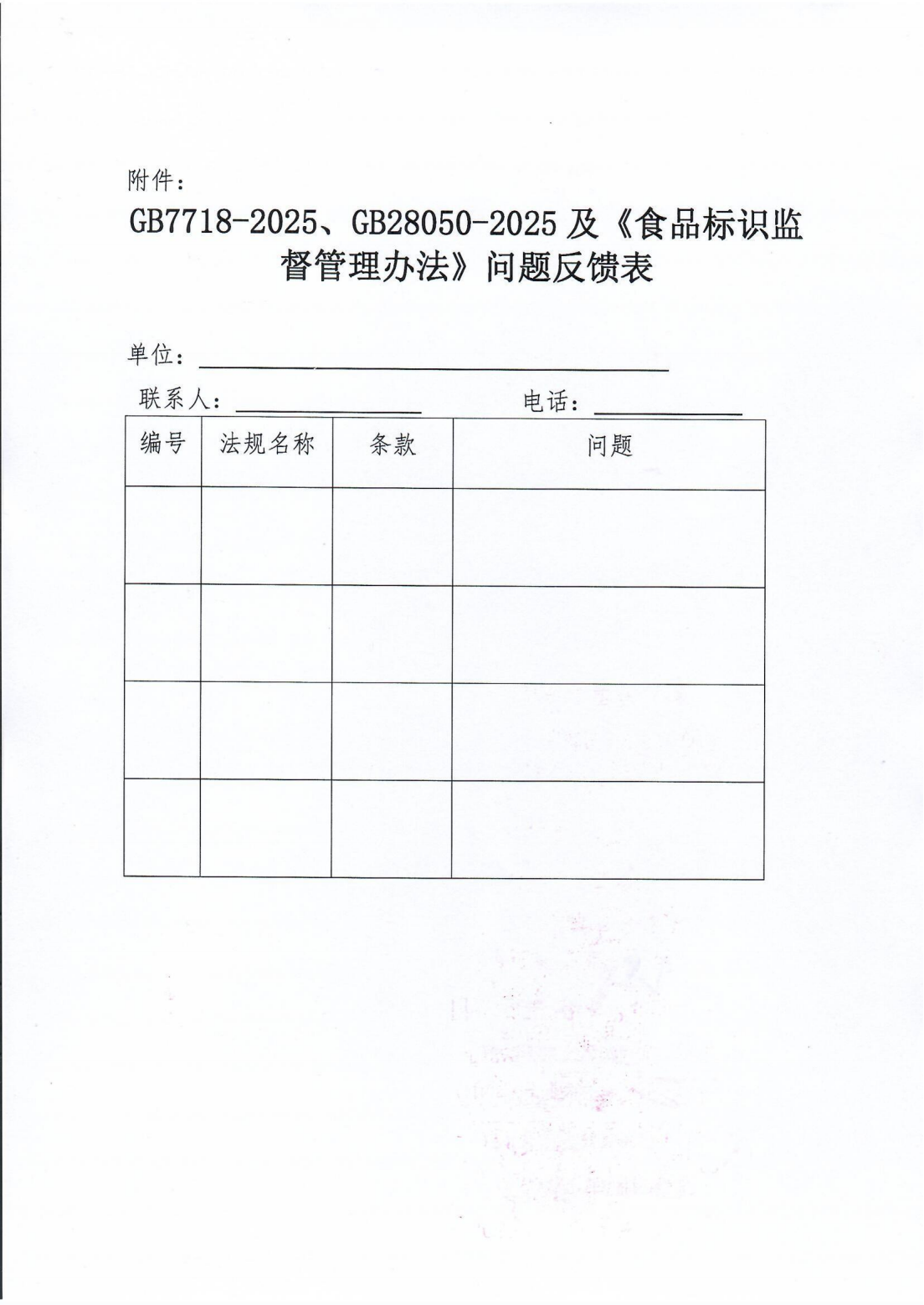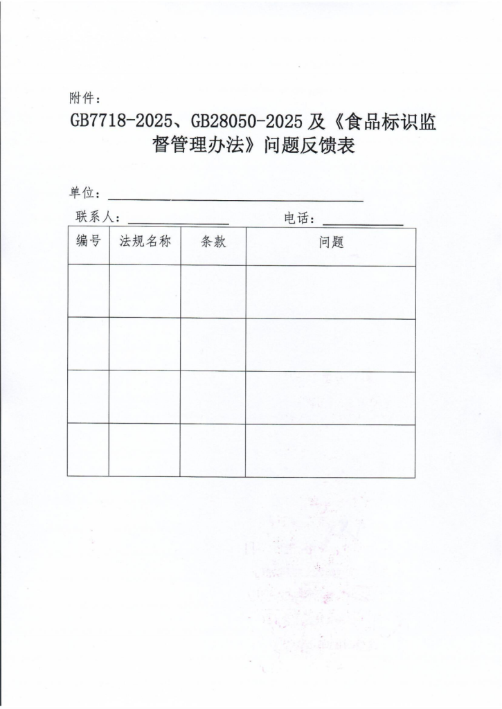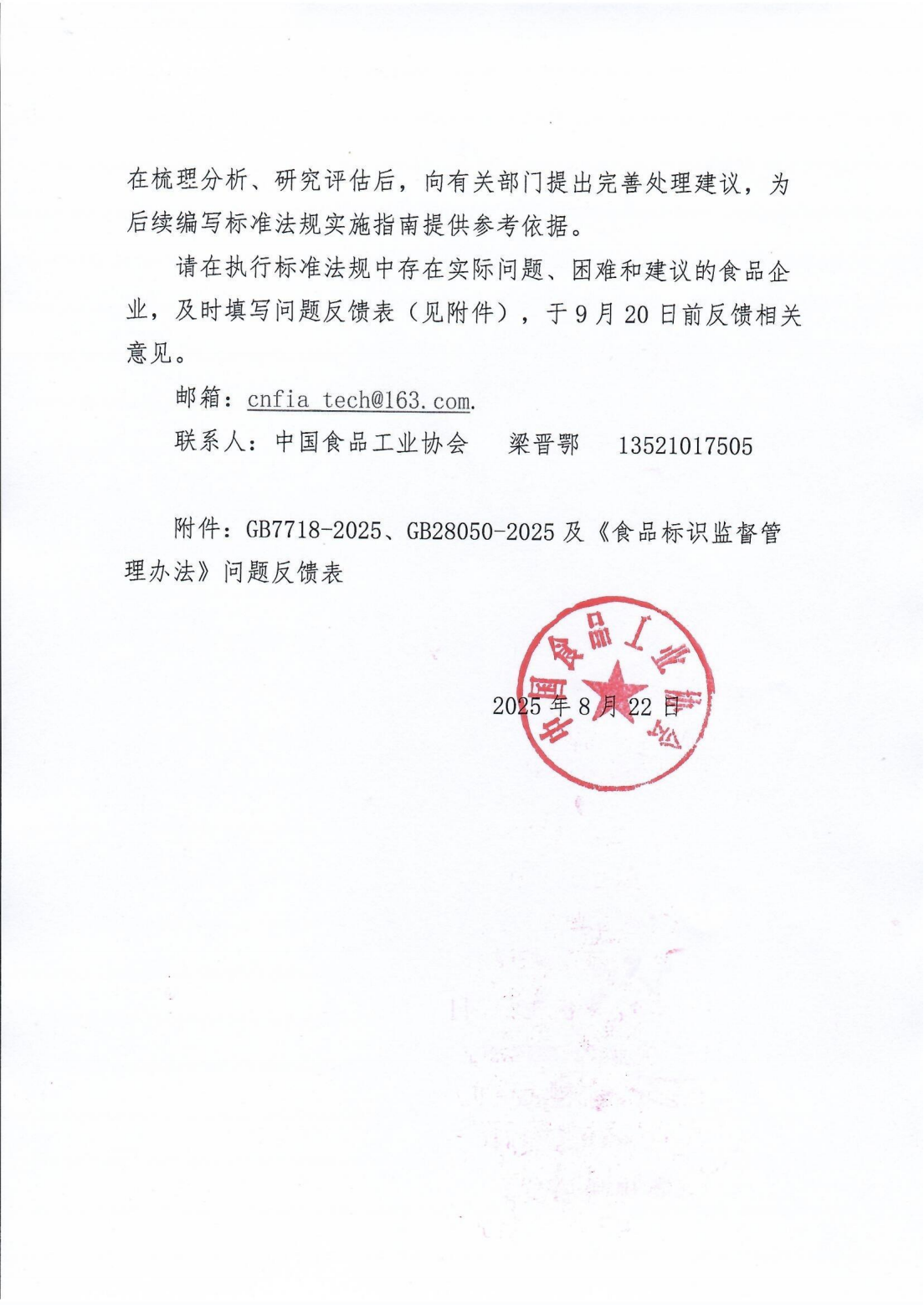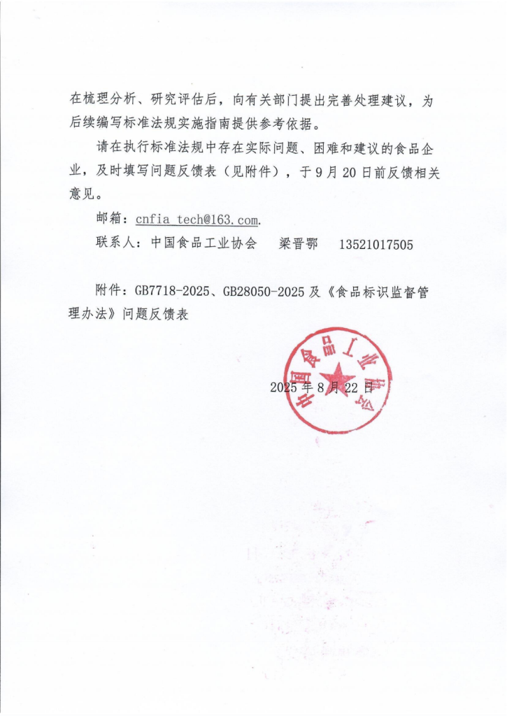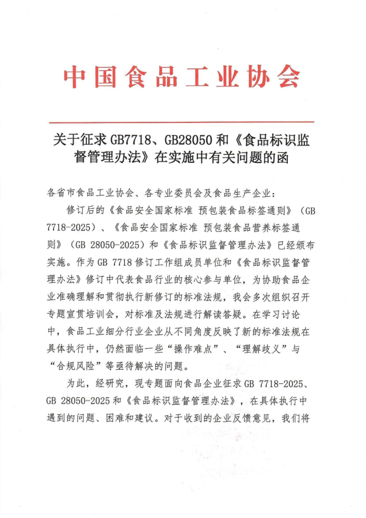关于征求GB7718、GB28050和《食品标识监督管理办法》在实施中有关问题的函 中国食协特食委 来源: 中国食品工业协会 2025年8月22日 17:49 中国食品工业协会:关于征求GB7718、GB28050和《食品标识监督管理办法》在实施中有关问题的函 下载附件: 附件 GB7718-2025、GB28050-2025及《食品标识监督管理办法》问题反馈表下载