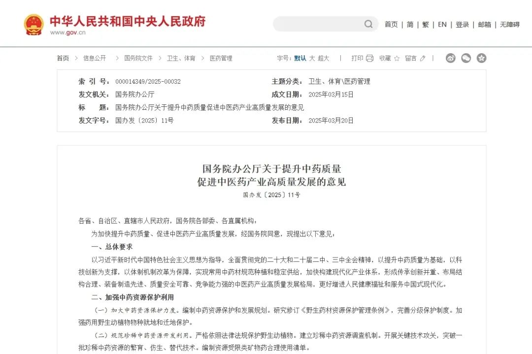 2025年3月20日,中国政府网发布了国务院办公厅颁布的《关于提升中药质量促进中医药产业高质量发展的意见》(以下简称《意见》),为药食同源产业的发展提供了明确的政策指导和支持。