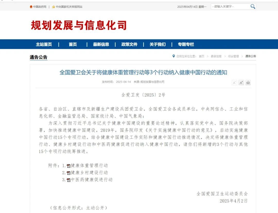 4月14日,国家卫健委官网发布了《全国爱卫会关于将健康体重管理行动等3个行动纳入健康中国行动》的通知。