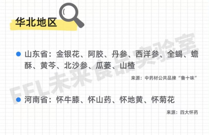 小结:资源丰富且多元化,江西、浙江等地的清单系统性强,铁皮石斛、灵芝等热门品种与白莲、芡实等传统食材并举。同时该地区科技创新活跃,是药食同源新功能研究和产品研发的高地,产品形态日趋精致和现代化,渠道优势明显。
