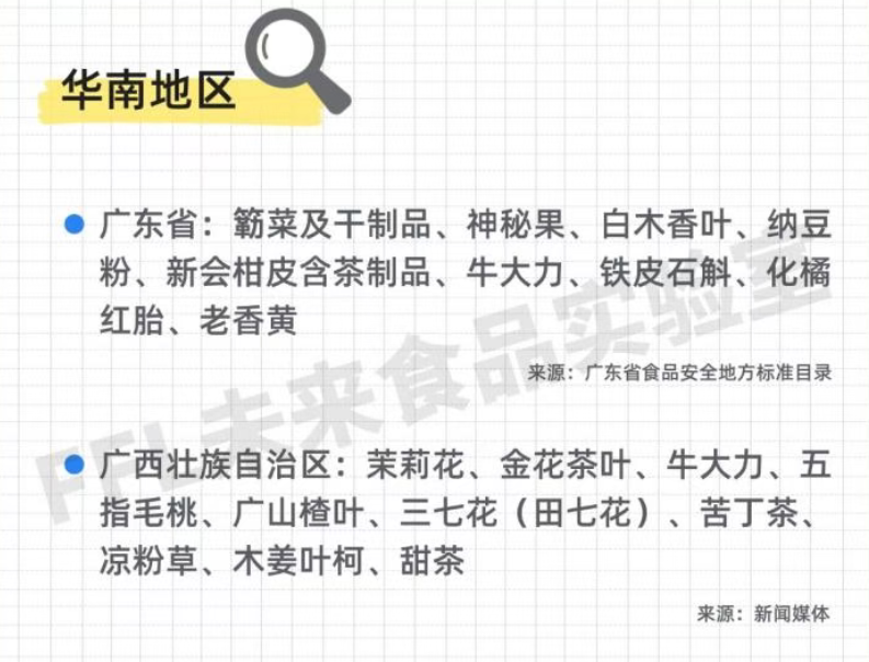 小结:得益于深厚的药膳传统和消费市场,地方标准制定走在前列,产品贴近日常消费,市场接受度高。且当地饮食文化特色鲜明,清单中包含大量可用于凉茶、汤饮和特色风味食品的原料,如广东的“三宝”(陈皮、老香黄、化橘红)和广西的多种凉茶草本。