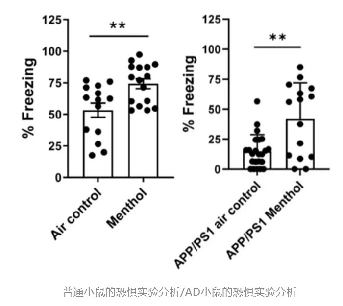 研究人员将普通小鼠与APP/PS1 AD小鼠模型分别放置在薄荷暴露组与安慰剂组中,并采用情境恐惧条件测试评估实验结果。结果显示,不管是普通小鼠还是AD小鼠模型,薄荷暴露组的小鼠都表现出比对照组小鼠明显更多的冻结反应,说明薄荷暴露组的小鼠的恐惧记忆更持久。
