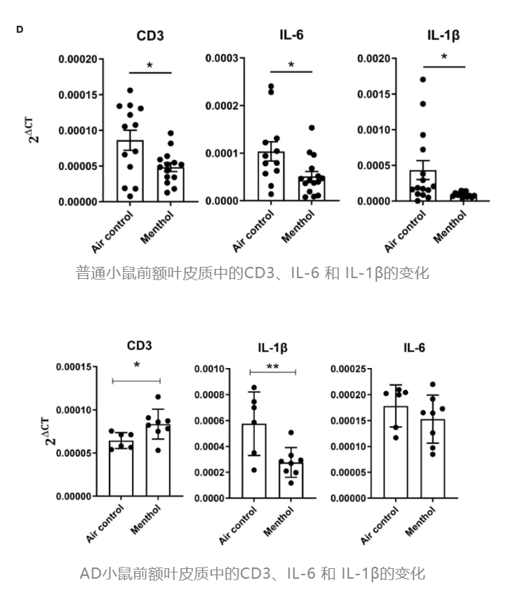 IFN-γ是一种多功能的细胞因子,是免疫系统中关键的调节分子之一。研究人员发现,通过吸入薄荷醇,薄荷暴露组小鼠的IFN-γ产生细胞的数量增加,对卵清蛋白(OVA)免疫的免疫反应增强,小鼠前额皮质中的 CD3 以及 IL-6 和 IL-1β 显著降低,减少了大脑的炎症反应,从而改善认知。