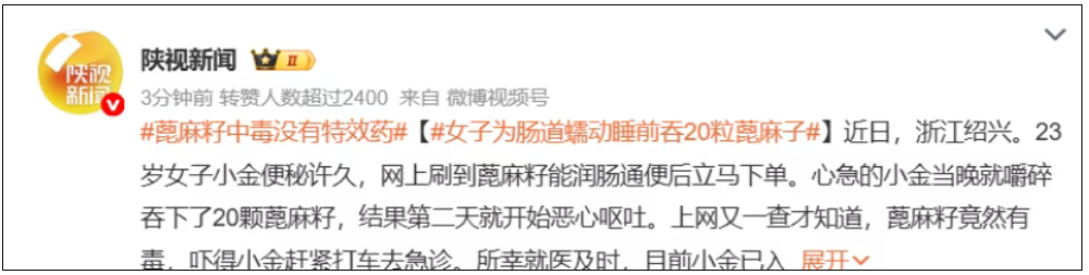 最近热搜上有个新闻说#女子为肠道蠕动睡前吞服20粒蓖麻籽#,内容是女子被便秘问题困扰很久,听信网上有人说蓖麻籽能润肠通便就立刻下单,结果吃了后恶心呕吐。