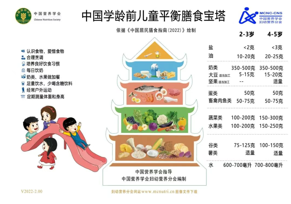 以4~5岁儿童举例,每日蛋白质推荐摄入量为30g,在保证乳制品350~500g基础上,补充畜禽肉鱼类50~75g、蛋类50g,再加上主食(100~150g)、蔬菜(150~300g)、水果(150~250g)里的蛋白质就可以满足一日所需了。